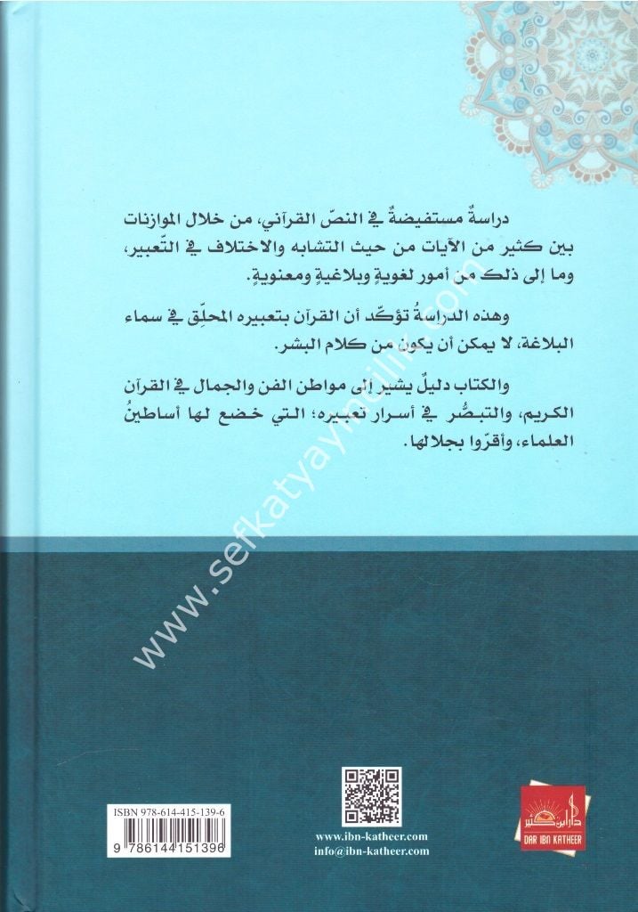 نبذة عن الكتاب : دراسة مستفيضة في النص القرآني، من خلال الموازنات بين كثير من الآيات من حيث التشابه والاختلاف في التعبير، وما إلى ذلك من أمور لغوية وبلاغية ومعنوية. وهذه الدراسة تؤكد أن القرآن بتعبيره المحلِّق في سماء البلاغة، لا يمكن أن يكون من كلام البشر. والكتاب دليل يشير إلى مواطن الفن والجمال في القرآن الكريم، والتبصُّر في أسرار تعبيره؛ التي خضع لها أساطين العلماء، وأقروا بجلالها.